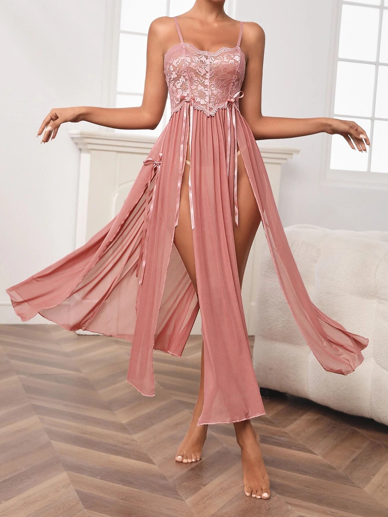 Transparan Dantelli Yırtmaçlı Elbise & Külot Takımı